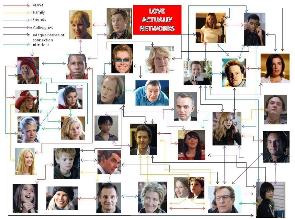 러브액츄얼리는 각 커플들의 옴니버스 형식으로 꾸며져 있고, 또한 등장인물은 직간접적으로 연결되어 있습니다.